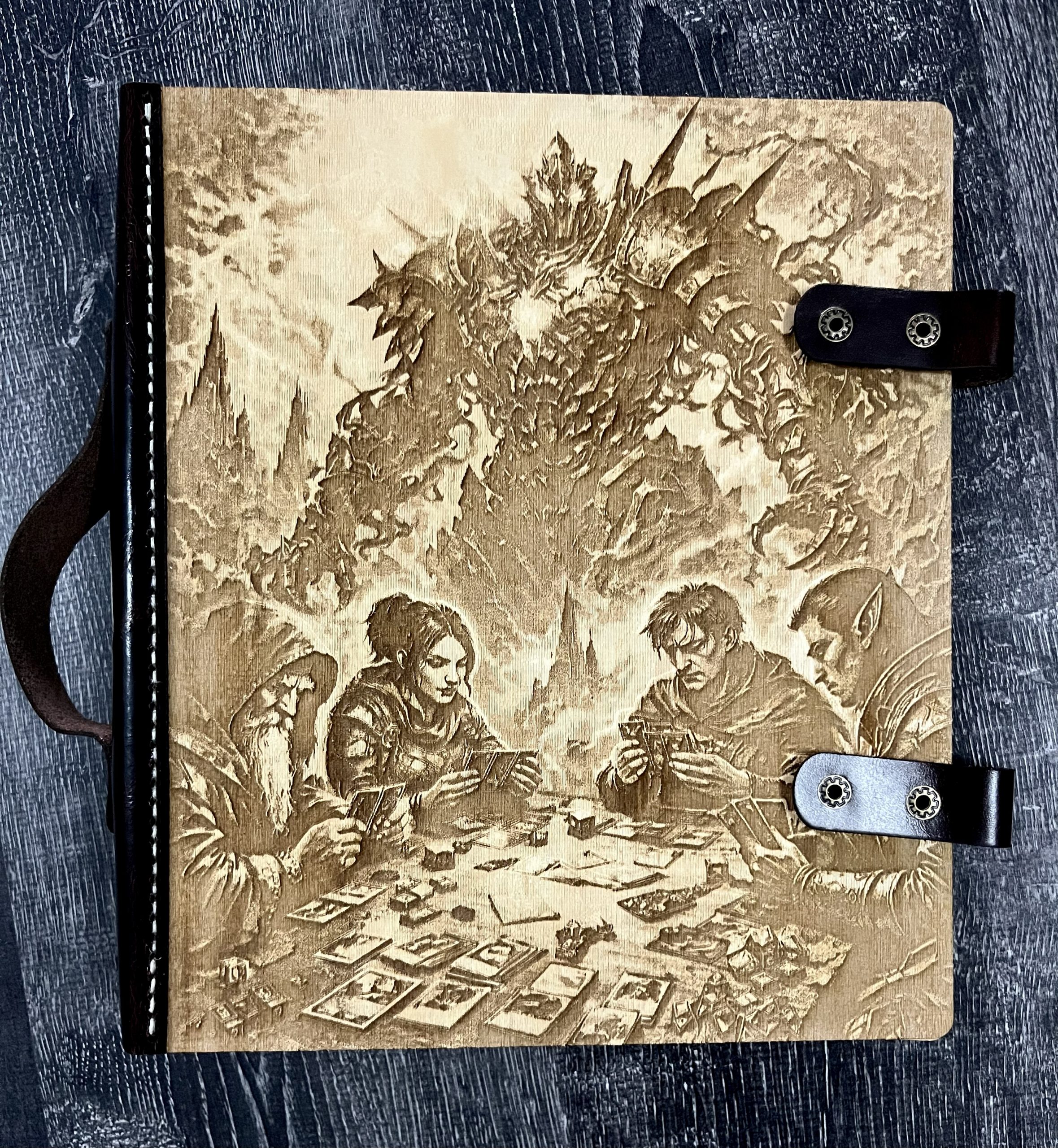 Our handcrafted binders are a stunning way to display and protect your favorite card collections, campaign notes, and more. Made from engraved white birch wood and hand-stitched to genuine leather, each binder blends beauty, durability, and high-end craftsmanship.