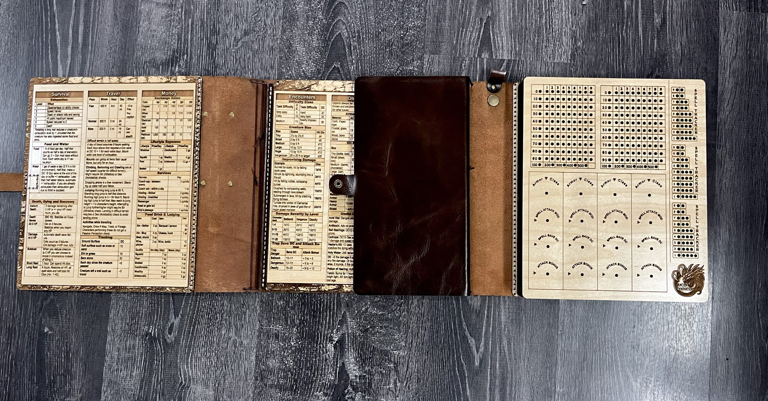 Handcrafted from engraved wood and hand-stitched genuine leather, this screen is built to command the table while keeping your secrets safely hidden behind its walls.