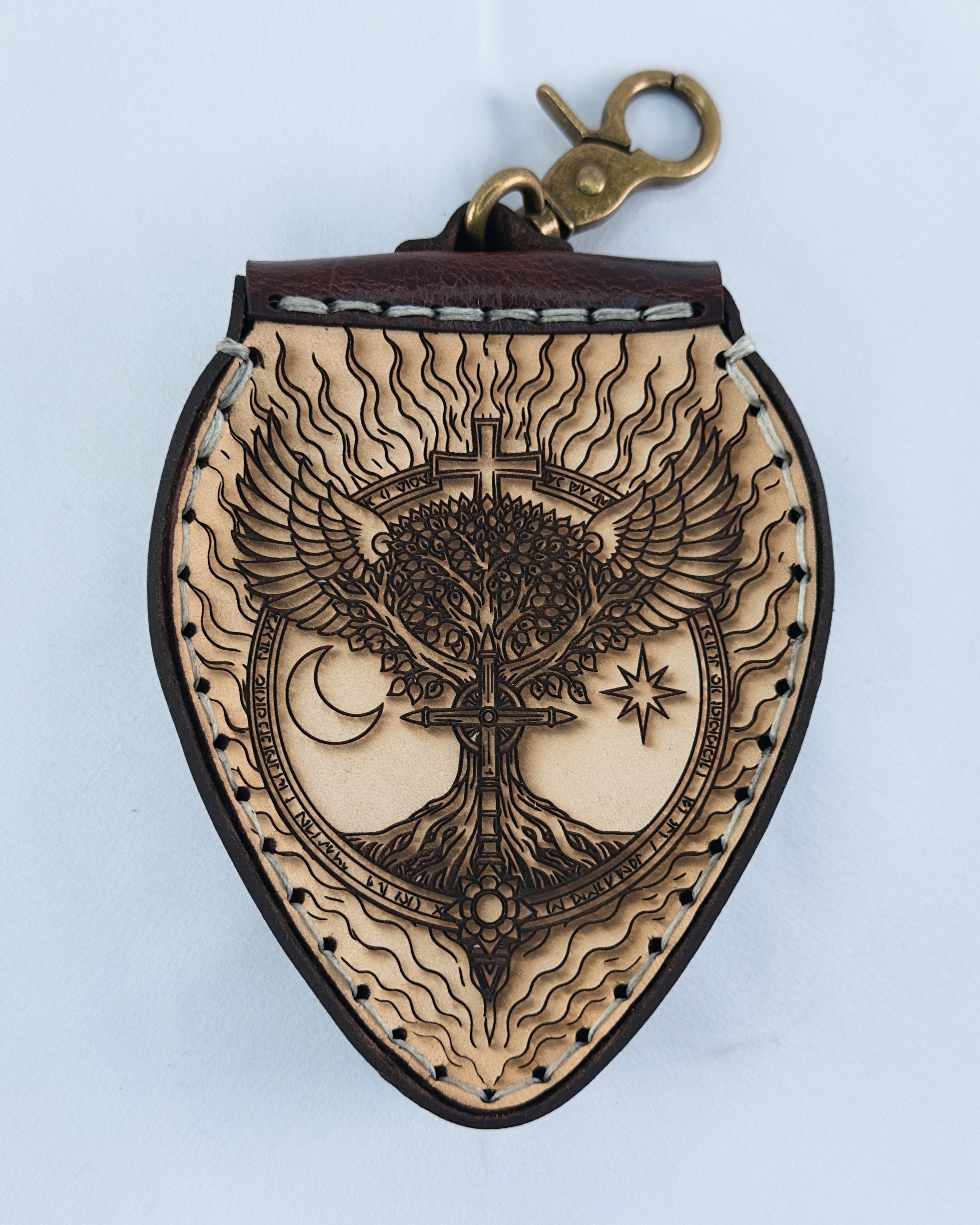 The front panel features deep engraved artwork, giving the pouch a bold fantasy look that feels like a piece of gear pulled straight from an adventurer’s pack. A secure snap closure keeps your items safe, while the brass clip allows the pouch to easily attach to a belt loop, bag, or backpack so your gear is always within reach.