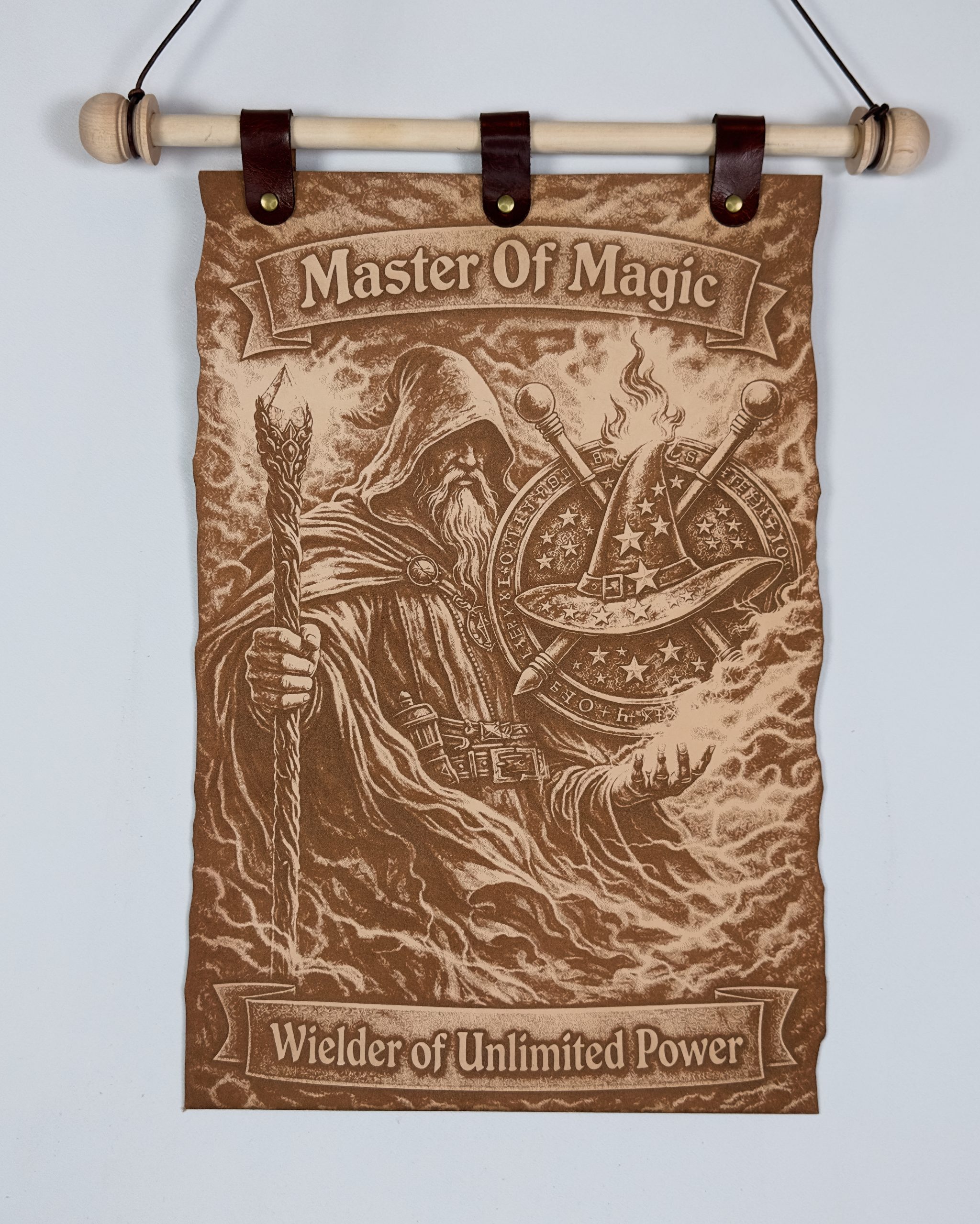 Every scroll is crafted with care in the workshop of Ancient Innovations using modern wizardry and old-world stubbornness. The leather engraving produces a warm, natural tone that grows richer with age—much like a seasoned bard’s stories, though considerably more reliable.