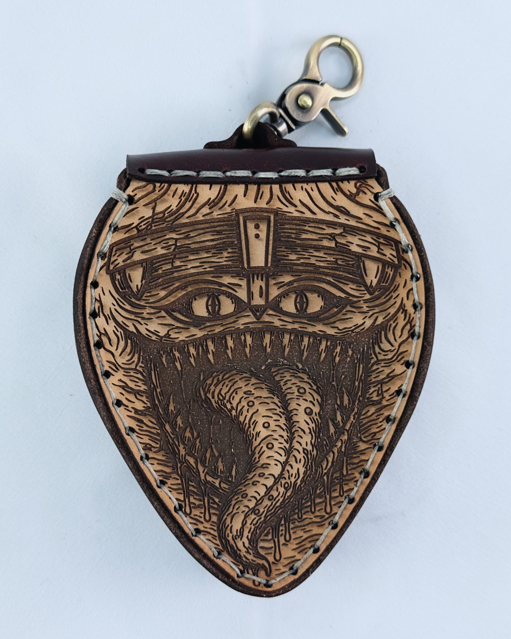 The front panel features deep engraved artwork, giving the pouch a bold fantasy look that feels like a piece of gear pulled straight from an adventurer’s pack. A secure snap closure keeps your items safe, while the brass clip allows the pouch to easily attach to a belt loop, bag, or backpack so your gear is always within reach.