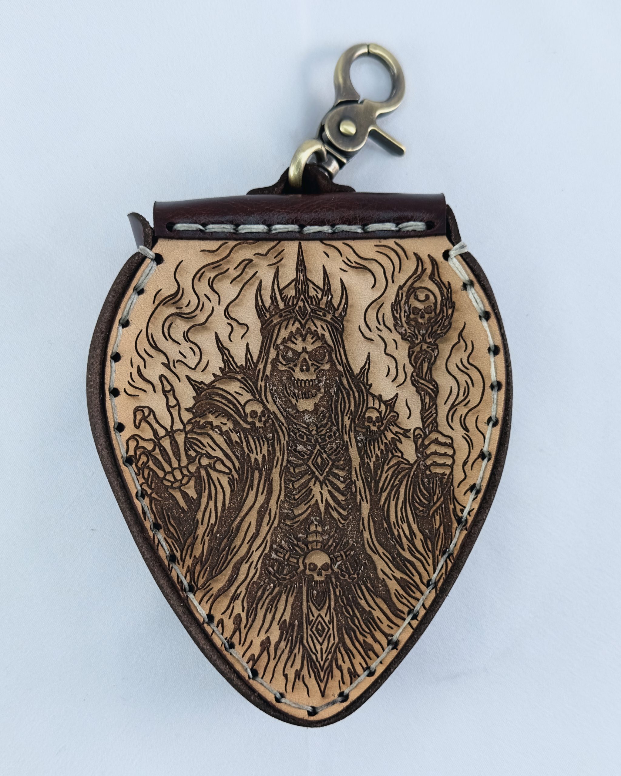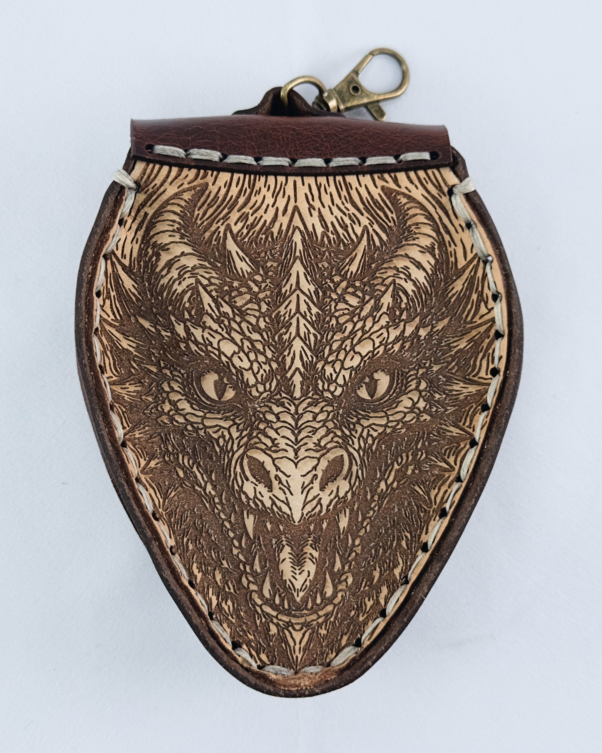 The front panel features deep engraved artwork, giving the pouch a bold fantasy look that feels like a piece of gear pulled straight from an adventurer’s pack. A secure snap closure keeps your items safe, while the brass clip allows the pouch to easily attach to a belt loop, bag, or backpack so your gear is always within reach.