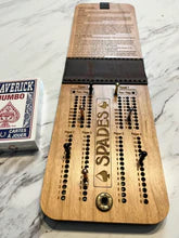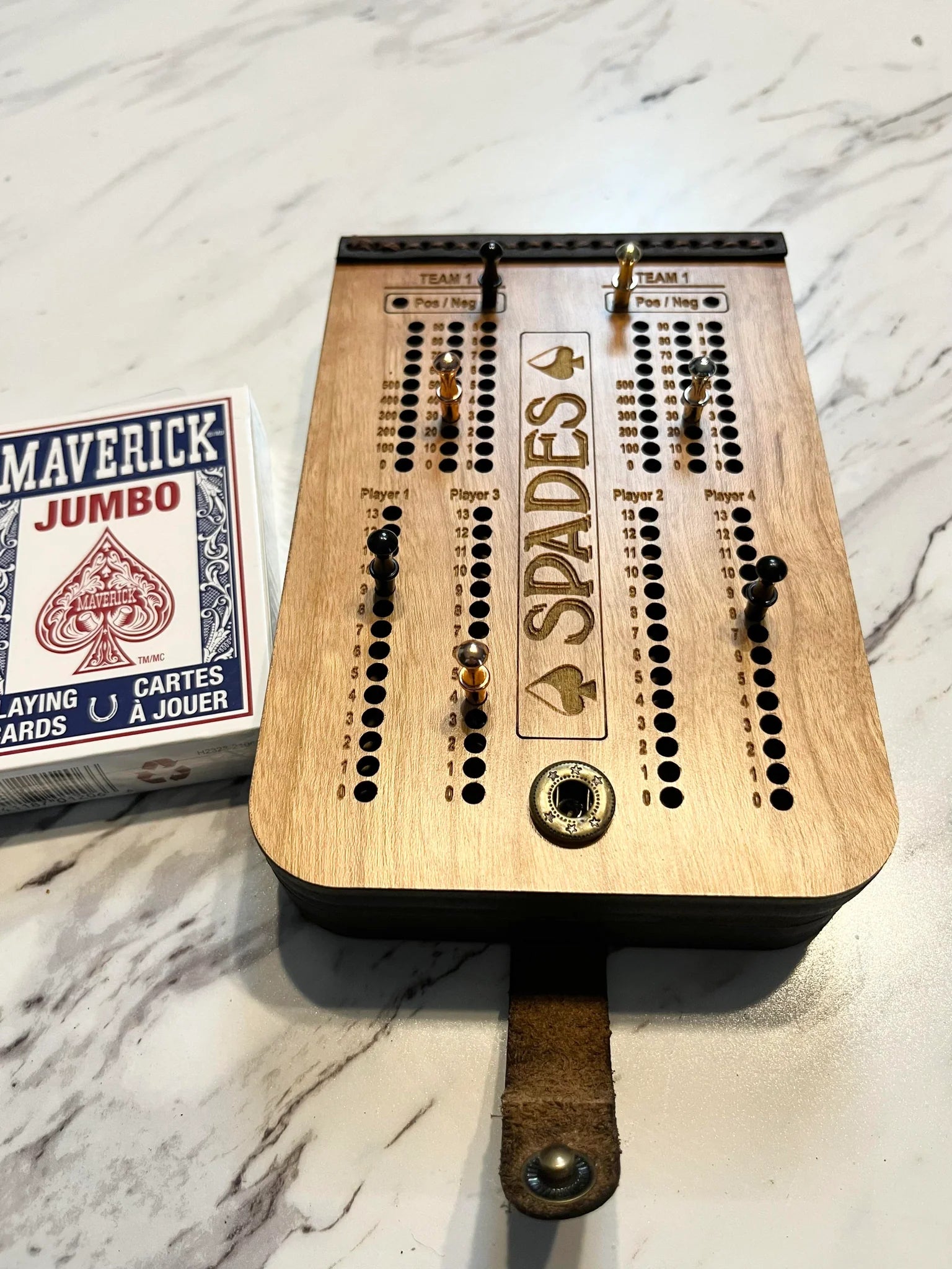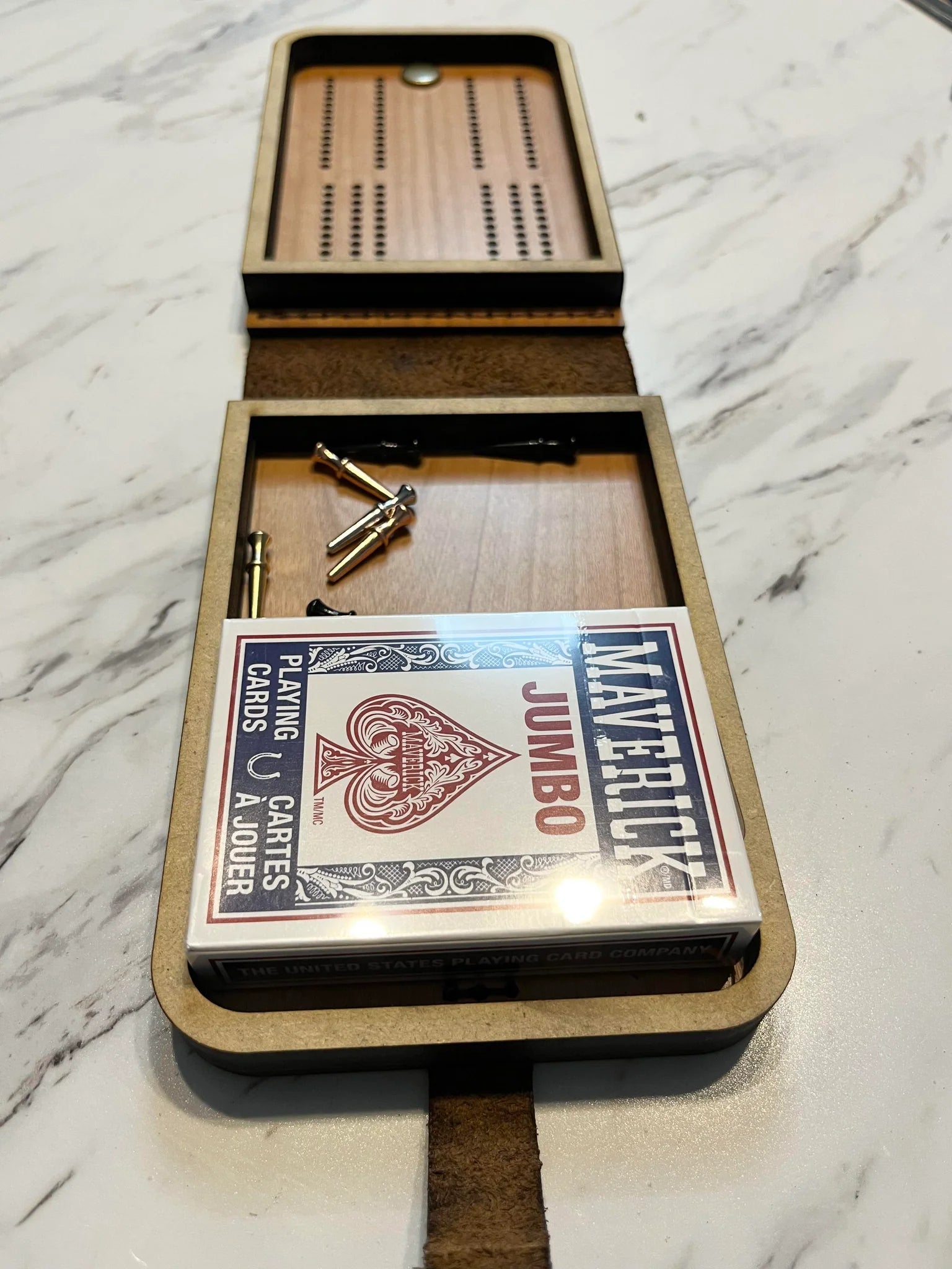 I use 1/8th” cherry for the tops of these and 1/4” mdf” wood to form the depth to contain all the pieces. Included in this set are cribbage pegs and deck of cards. The pegs sit securely in the holes so no falling out at a bump. I handstitch the leather binding to the wood making these the perfect gifts for the hard to buy for.