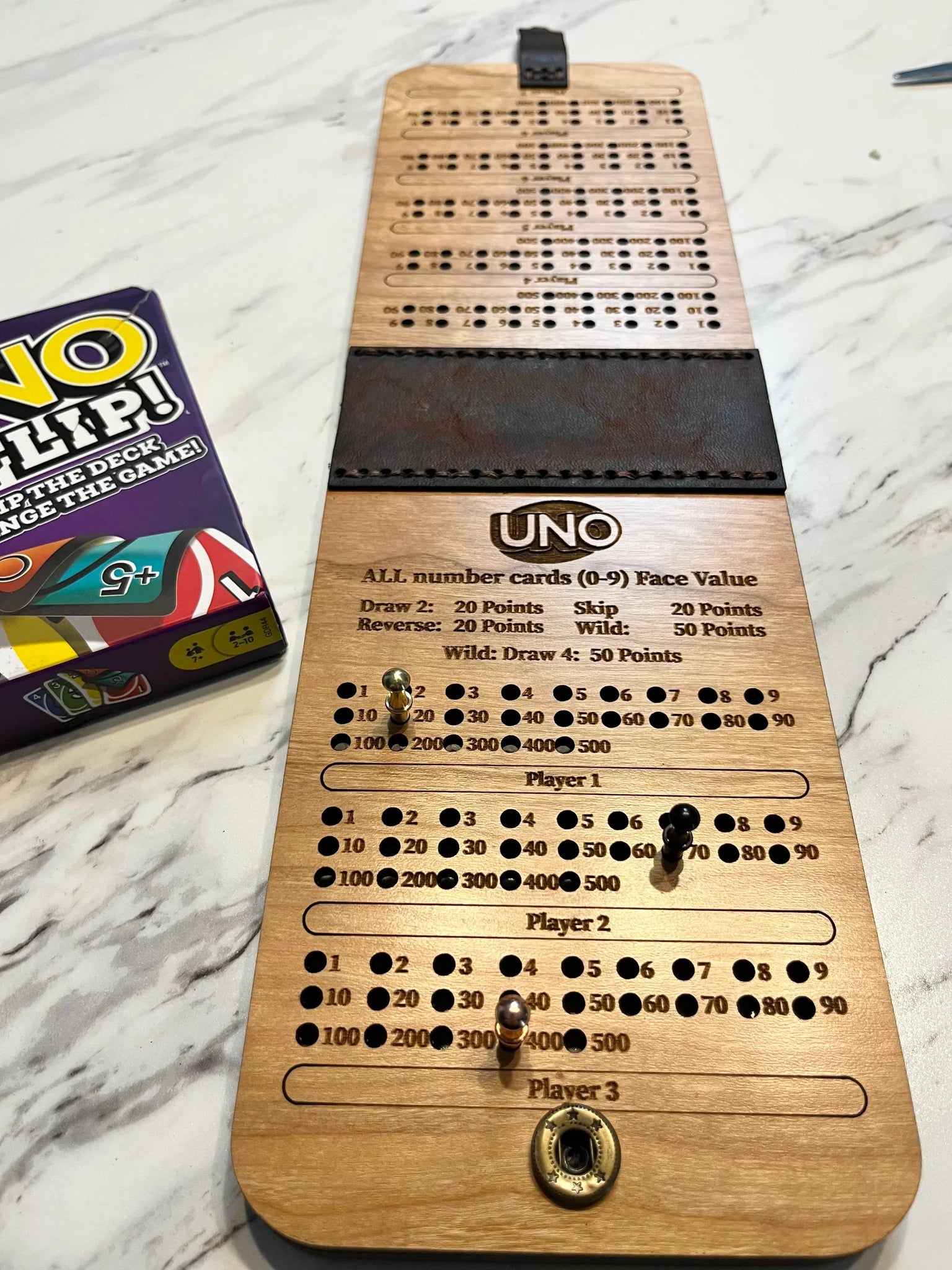 I use 1/8th” cherry for the tops of these and 1/4” mdf” wood to form the depth to contain all the pieces. Included in this set are cribbage pegs. The pegs sit securely in the holes so no falling out at a bump. I hand-stitch the leather binding to the wood making these the perfect gifts for the hard to buy for.Â