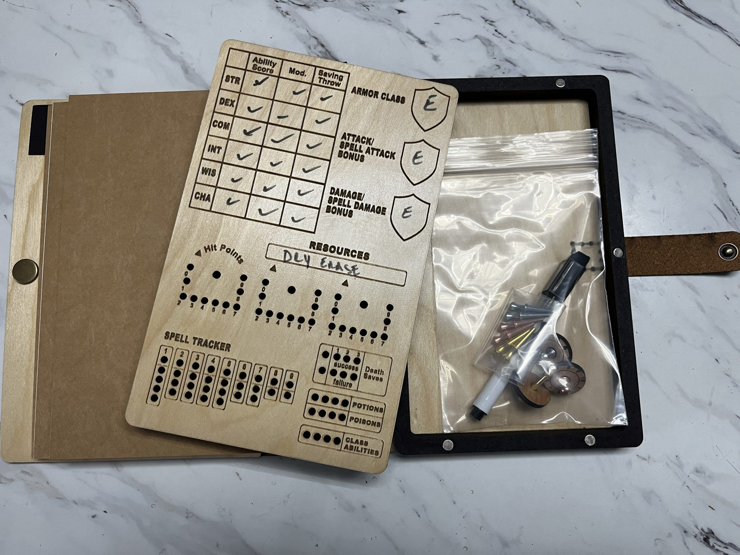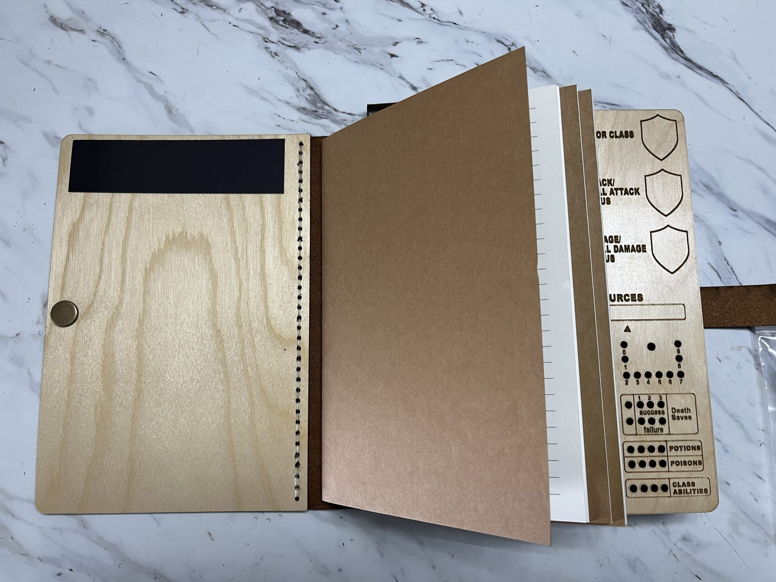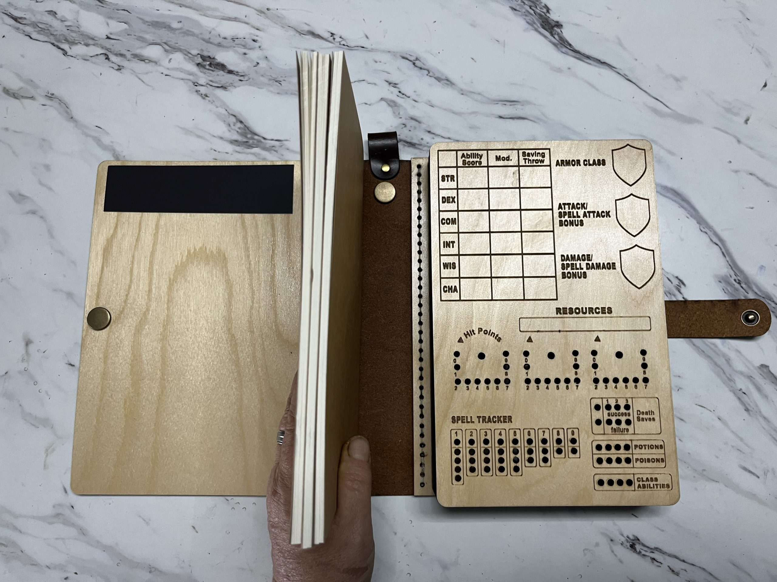 Tame the chaos of game night with this handcrafted RPG Player Tracker, forged from engraved white birch and hand-stitched genuine leather. Built for adventurers who prefer their gear organized and their notes ready at a moment’s notice.